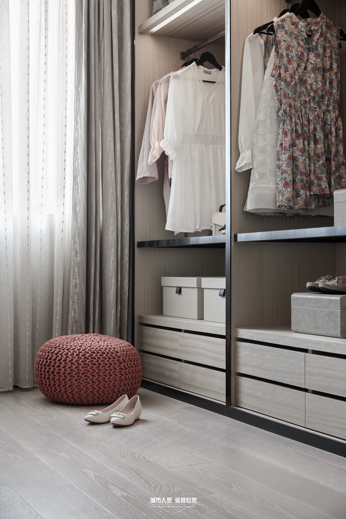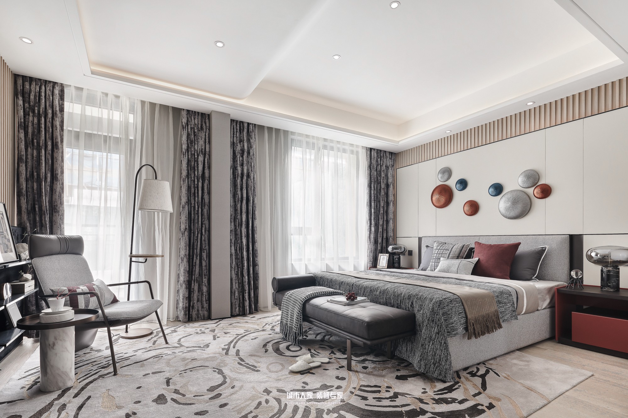 本案為現(xiàn)代主義風(fēng)格,回溯現(xiàn)代主義的源頭,首先想到的是“減”字,只有減少裝飾才能讓空間單純,設(shè)計(jì)滿足工業(yè)生產(chǎn)的要求,然而減得過多就會(huì)“Less is bore”,不免枯燥,脫離生活。